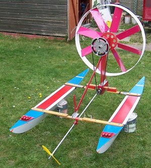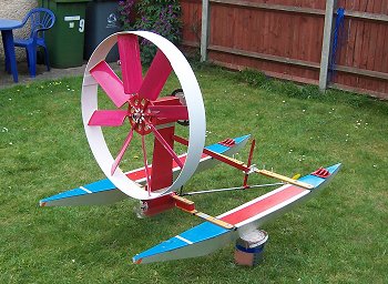 Because of the slow rotation, more wind blades are needed to cover the swept area of the rotor disk.. I usually made rotors with six or eight blades. The optimal design of wind turbine to give best thrust directly into the wind is so different than usual that I gave it the name "Rotary Sail". Why this name? Because each blade could be compared to a sail of a boat but rotating instead of being fixed to the boat and operating in similar airspeeds. The "Rotary Sail" idea was specifically designed to be used with wind directly ahead or direction about 45 degrees either side, it would not be optimal with full sidewinds because the gear ratio to the propeller would have to be changed and the rate of rotation increased which would lead to other modifications being required to the rotor blades. It would be ideal if another form of wind drive could be added such as a self-trimming wingsail. This would lead to a hybrid type of boat with both rotary sail and wingsail. Some of the testing I did was to see how SMALL a rotary sail could be and still be able to push a boat into the wind. For ease of use it would be desirable if the circumference of the rotary sail did not exceed the beam of the ship so that docking next to other ships or a dock would not lead to interference with the blades. Testing on models I found it was possible to have an effective rotary sail that was much smaller than the beam of the boat it was powering, and yet was still be able to drive the boat to windward.