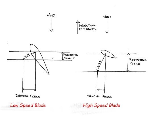 - 2 types of rotor blades are compared. I found that the most effective kind of wind turbine was a slow speed high torque design with the pitch of the blades set at no more than 45 degrees to the wind when stationary. With this 45 degree wind blade angle it means that the average of the blades rotation velocity does not exceed the speed of the wind. For example: in a 10 knot wind the speed of the turbine blades through the air would be 10 knots also. This would be a tip speed ratio of 1 - very low compared to the normal wind turbine tip speed ratios which are between 6 and 10. This slow rotation speed has many advantages. The operation of the turbine is safer and gentler than the usual type of wind turbine which has frightening blade speeds sometimes approaching the speed of sound at the tips. The blades on my own design do not need to be strong and heavy. In fact the wind blades on the 12 foot catamaran which I was using for testing "Jensa" were based on model aircraft wings and were open frame made of balsawood and were strong enough and never suffered any failure. The pitch of the blades was controllable from zero degrees to the 45 degree angle with a similar mechanism to a helicopter rotorhead. This can be seen in the video.